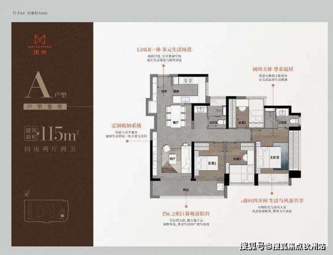 115㎡的4房2厅2卫,A户型(1栋1单元05户型),设计的是经典竖厅格局,进门入户玄关,LDKB一体化,S墙设计预留冰箱卡槽位,四开间朝南,动静分区,主卧双面飘窗,客厅连接次卧出6.2米长的巨幕大阳台,U型厨房,公卫三段式分离,得房率76.77%(不含赠送),套内面积88.71㎡,东南朝向,靓点是2个最小的次卧都不用睡飘窗。