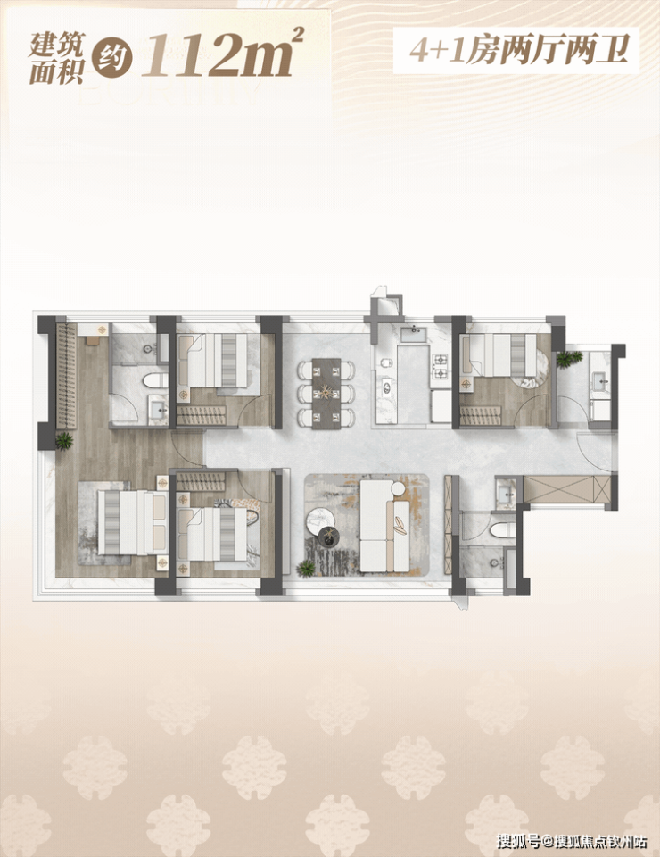 户型信息:主力户型有 99㎡3+1 房两厅两卫和 112㎡四房两厅两卫,得房率约 110%。其中,99㎡户型采用约 35㎡LDKB 一体化设计,可变双套房,有 270° 视野;112㎡户型有约 16 米通风面,户户端户,配备 28㎡行政级主卧套房。