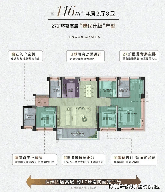 高层产品:为 2 梯 4 户 “深呼吸 T4 风车楼型”,主力户型为建面约 91-115㎡三四房。其中约 91㎡户型为 4 室 2 厅 2 卫,总价 146 万起,户型方正,有 10 个飘窗设计,赠送面积充足;约 115㎡户型为 4 室 2 厅 2 卫,是横厅产品,主次卧配备 270° 环幕视野,采光与观景效果佳。