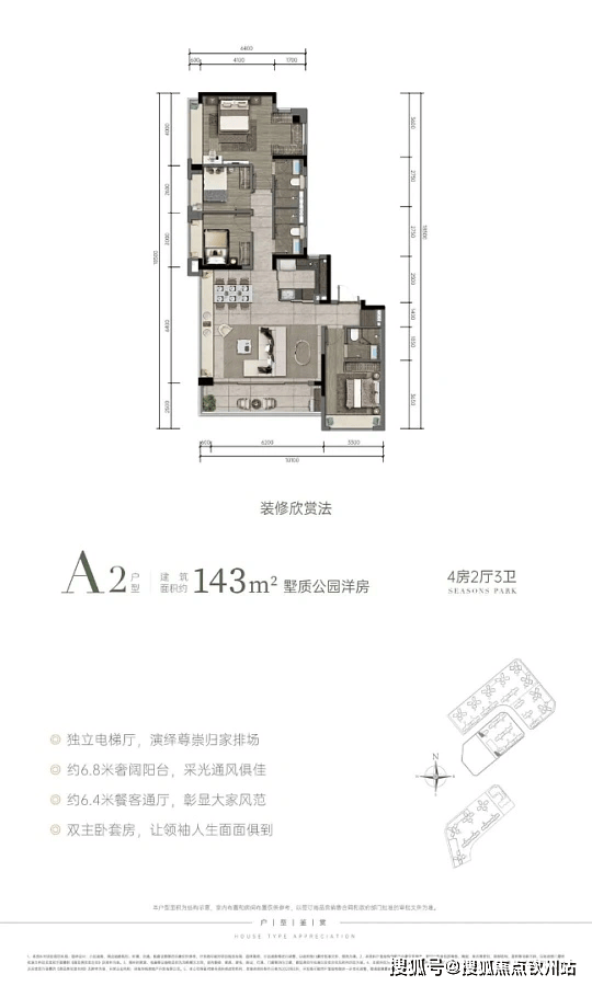 洋房产品:主力为建面约 129-143㎡四房双套卧户型,采用四开间朝南设计。其中约 129㎡洋房是双套房设计,约 143㎡洋房配备约 57㎡LDKG 一体化空间和约 6.6 米宽景阳台。