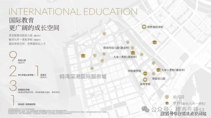 教育资源方面,项目周边拥有15所幼儿园、4所义务教育学校,还有荔湾小学和深大附中等学校都在周边。此外项目靠近多所国际学校,拥有3000到5000个名额,包括荟同国际学校、礼德国际学校、英国国王学校(深圳分校)以及深圳哈罗国际学校。临近小区南侧有一块九年制教育用地,但目前未招标。入住早期可能要到妈湾南二外学校或者前湾南二外学校上学。