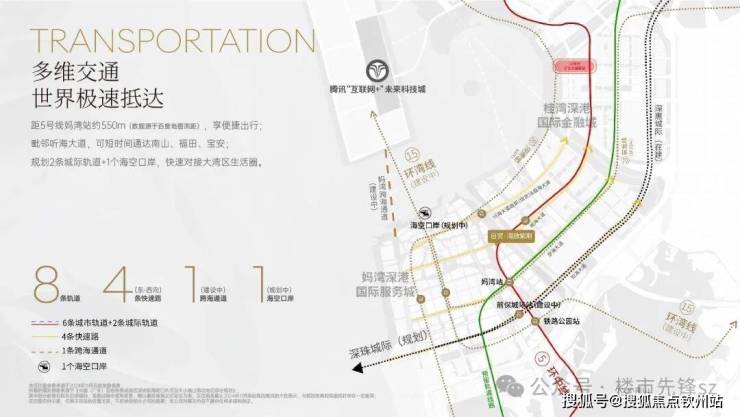 交通配套方面,项目距离5号线妈湾站约600米均在步行便捷范围之内。未来将于宝安新老中心、南山重点区、蛇口、西丽、前海片区串联起来,此外,将还有15、21、27、穗莞深城际等多条轨道交通串联前海与其他重点片区。