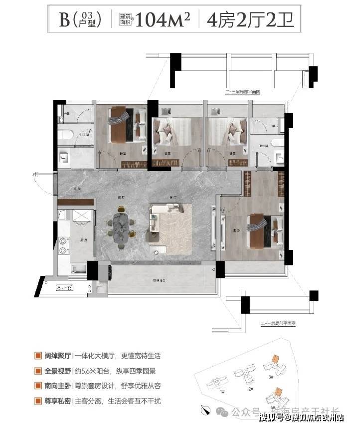 约104㎡ 4房2厅2卫:方方正正,一体化大横厅,5.6米大阳台