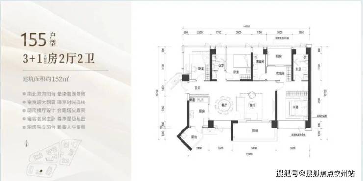 (1)105㎡3房2卫:双龙抱珠格局,朝东/南,阳台开间6.5米,适合刚需家庭。
