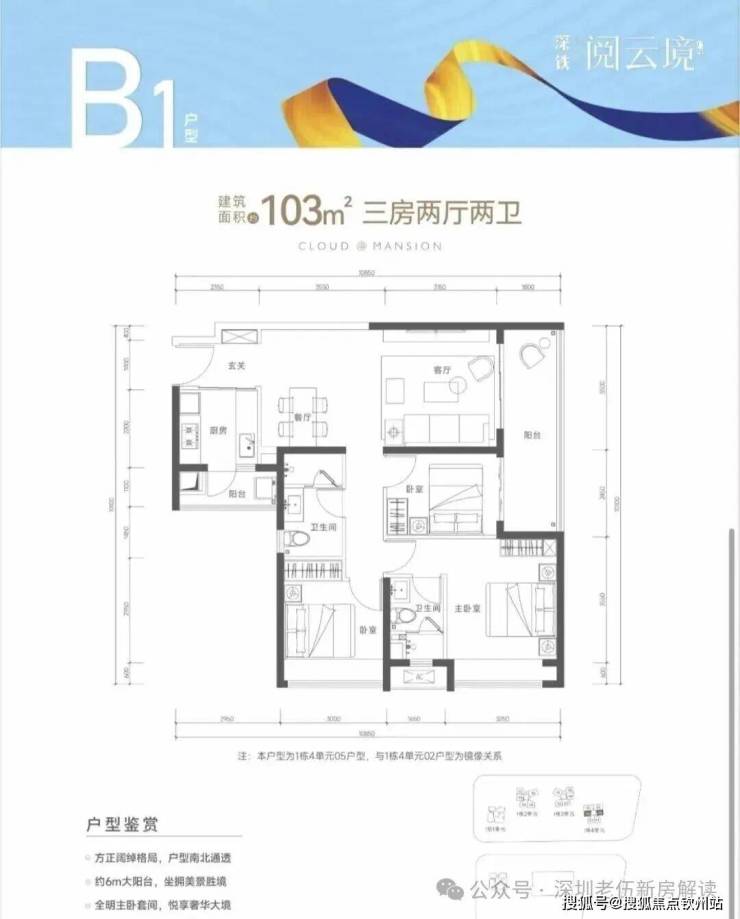 103㎡的3房2厅2卫,B1-1栋4单元02.05户型,设计的是经典竖厅格局,进门入户玄关,客厅3.5米开间,LDKB一体化,S墙设计预留冰箱卡槽位,三开间朝南,动静分区,3个卧室分别做到了主卧15.13㎡/次卧10.05/次卧7.71㎡(包含墙体飘窗),二字型厨房带1个3.24㎡大的生活阳台,卫生间干湿分离,得房率80%(不含赠送),客厅连接次卧出10.71㎡大阳台,正西或正东朝向。套内面积82.6㎡+赠送面积10.72㎡=实际使用面积93.32㎡,加上赠送后得房率约90.04%。