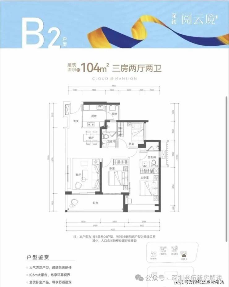 104㎡的3房2厅2卫,B2-1栋4单元03.04户型,设计的是经典竖厅格局,进门入户玄关,客厅3.5米开间,LDKB一体化,S墙设计预留冰箱卡槽位,三开间朝南,动静分区,3个卧室分别做到了主卧16.1㎡/次卧9.12/次卧6.89㎡(包含墙体飘窗),二字型厨房带1个2.43㎡大的生活阳台,卫生间干湿分离,得房率80%(不含赠送),客厅连接次卧出11.43㎡大阳台,正南朝向。套内面积82.81㎡+赠送面积10.14㎡=实际使用面积92.95㎡,加上赠送后得房率约89.45%。