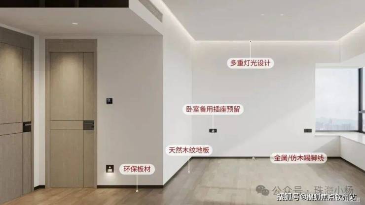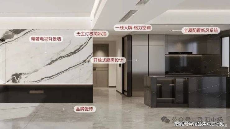 专属定制门牌号、石材/仿石纹大板地砖、客厅背景墙、无主灯极简吊顶、全景移门、通高门楣等42项颜值品质空间,精奢居感生活体验。