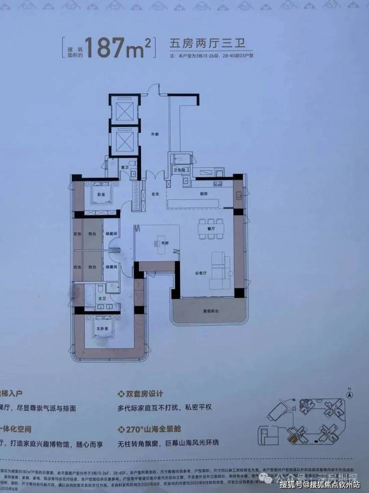 将地标高度/创新设计/极致景观/自然融合四大要素集于一体,约150米地标建筑以45°错位转体设计,实现四户分踞四角的独立瞰景布局,每户均可享有极致山海景观。约55米超宽楼间距、0.6的黄金窗墙比远超常规住宅0.3-0.5的标准,呈现山景、海景、花园三重景观界面。