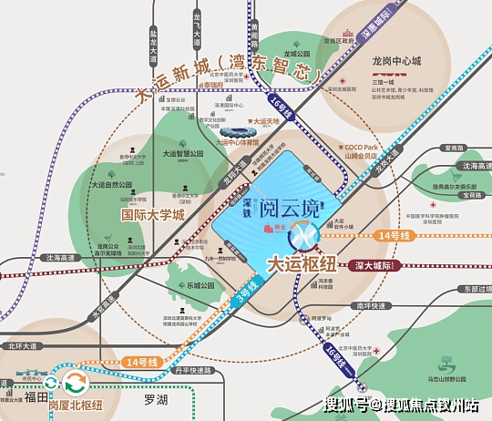 ✅交通:大运枢纽站上盖,地下室直达 3/14/16 号线,5 站到布吉、6 站到罗湖、7 站到福田黄木岗、8 站到岗厦北;深大城际(2026 年开通)直通宝安机场,2 站到五和、3 站到民治北,未来衔接惠州大亚湾,多维轨道畅行大湾区