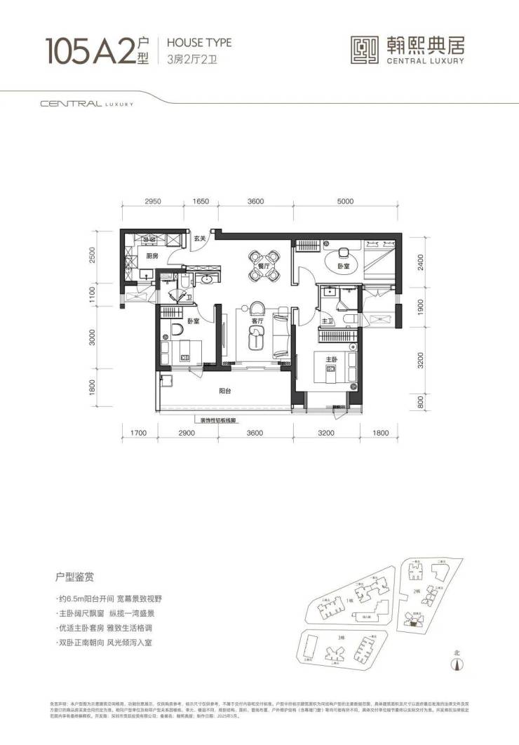 (1)105㎡3房2卫:双龙抱珠格局,朝东/南,阳台开间6.5米,适合刚需家庭。