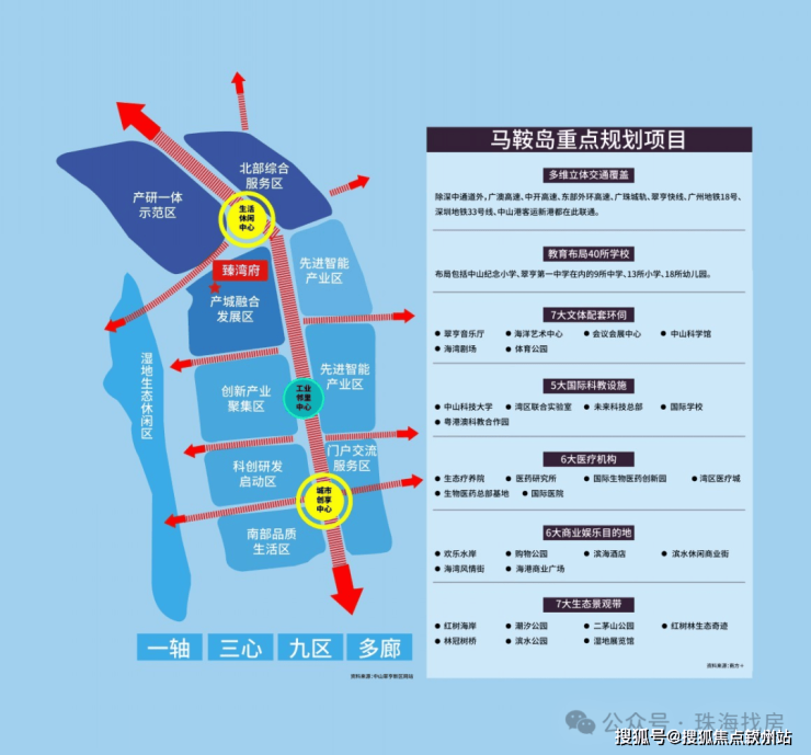 翠亨音乐厅、海洋艺术中心、会议会展中心、中山科学馆、海湾剧场、体育公园、大湾区博物馆等7大文体荟萃,形成艺术情操陶冶高地。6大医疗机构 打造国际医疗康养先行区