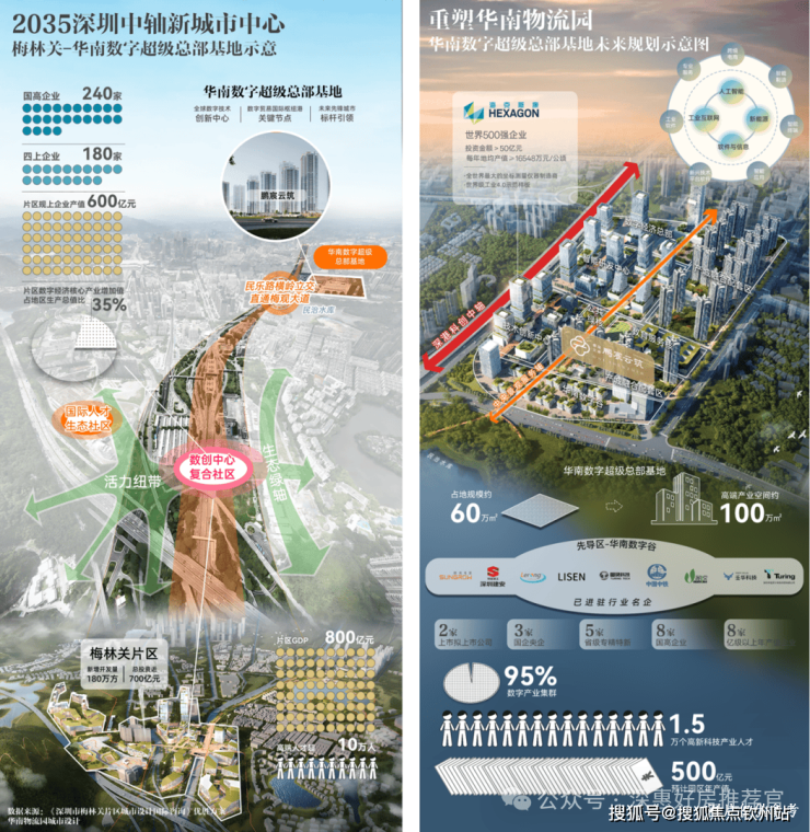 对标深超总、腾讯企鹅岛及香蜜湖国际金融中心,四大微城市之一,产学研商住定位,世界500强海克斯康已落户,已集聚35+龙头名企,打造湾区数智产业集群,数字产业集群度达95%,驱动板块加速蜕变。