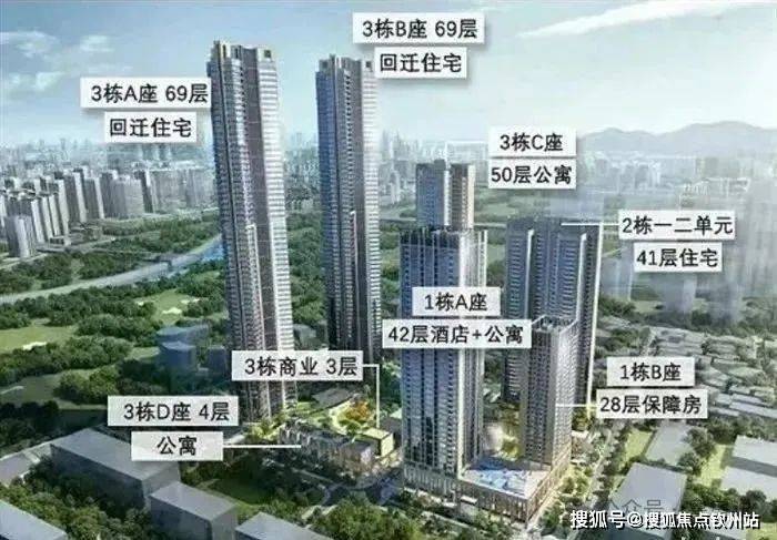 总栋数:8栋(1A栋42层酒店+公寓、1B栋28层保障房,2栋1/2单元41层住宅,3A/3B栋69层住宅;3C栋50层公寓、3D栋4层公寓)