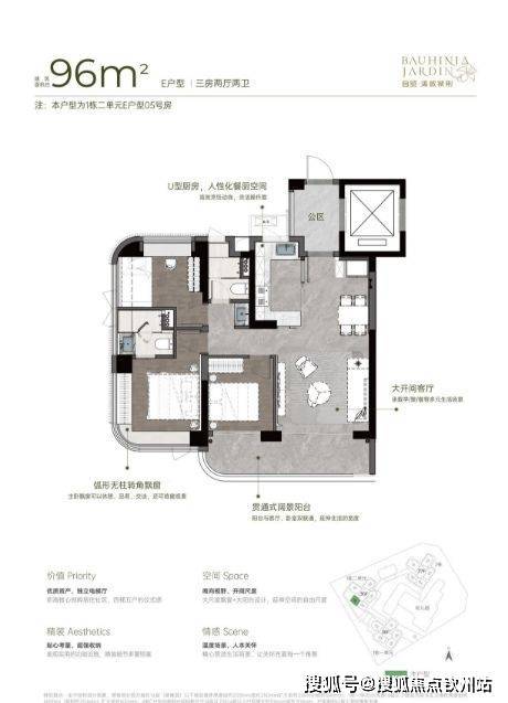 6㎡3房2厅2卫,专梯入户可以利用做玄关和鞋柜,U型厨房,入户直接到餐客厨(LDK)空间。客厅开间大,通阳台联通着卧室,房子外围采用弧形设计,主卧室大套间,户型亮点厨客厅好用。