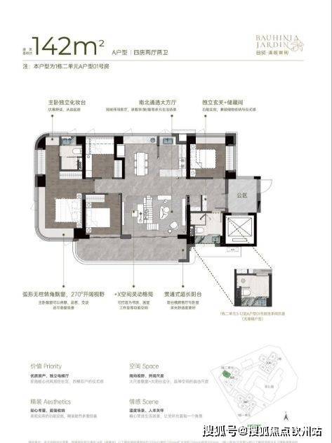142㎡4房2厅2卫,专梯入户可以利用做玄关和鞋柜,U型厨房,入户直接到餐客厨(LDK)空间。竖厅的南北通透格局,厨餐一体和超大横客厅设计,贯通式超长阳台,主卧带有大衣帽间和独立卫浴,户型是项目舒适度最高的户型。