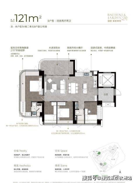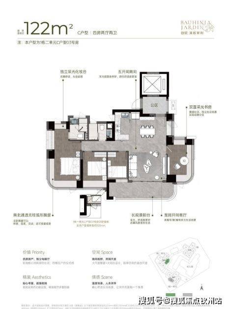 122㎡4房2厅2卫,专梯入户可以利用做玄关和鞋柜,U型厨房,入户直接到餐客厨(LDK)空间。厨餐空间超大,客厅靠书房,长景观阳台连通卧室,主卧室大套房带衣帽和独立卫浴设计,户型亮点是通透和厨餐的空间好用。