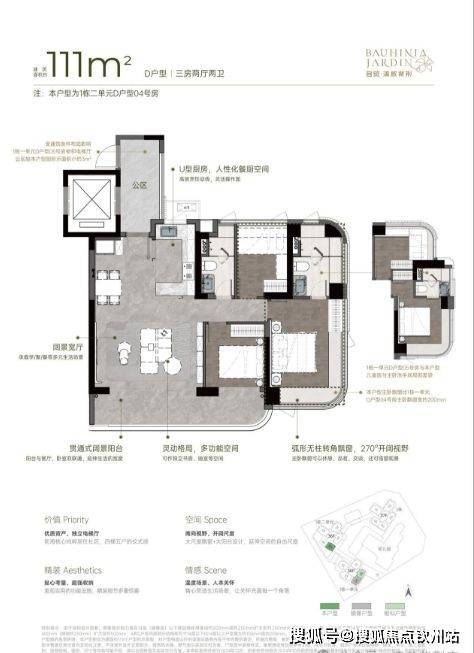 111㎡3房2厅2卫,专梯入户可以利用做玄关和鞋柜,U型厨房,入户直接到餐客厨(LDK)空间。客厅开间大,大阳台连接着卧室,主卧大套房南北通透的格局,户型亮点在厨餐客阳台一体空间好用,主卧室大。