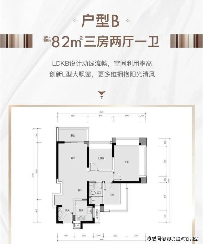 82㎡的3房2厅1卫(户型B),设计的是经典竖厅格局,进门入户玄关,客厅3.3米开间,LDKB一体化设计,动静分区,3个卧室分别做到了3.5米/2.7米/2.55米的宽度,主卧加1个次卧270°飘窗设计,U型厨房,得房率:77.5%(不含赠送),全部东北朝向。