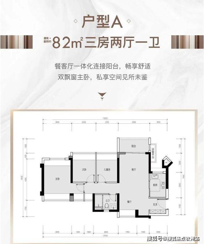 82㎡的3房2厅1卫(户型A),1栋/3栋1单元的05户型,设计的是竖厅南北通透格局,进门入户玄关,客厅3.3米开间,LDKB一体化设计,3个卧室分别做到了3米/2.55米/2.35米的宽度,主卧双飘窗南北通设计,U型厨房,得房率:77.51%(不含赠送),阳台主朝东北向。