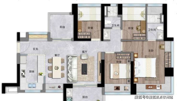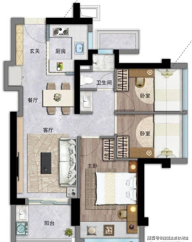 约86㎡3房2厅2卫:也是竖厅设计, 进门入户玄关,S墙设计预留冰箱位,U型厨房,餐客厅一体连接阳台,公卫三段式分离,不同的是,三开间朝南,阳台是东南或西南朝向。