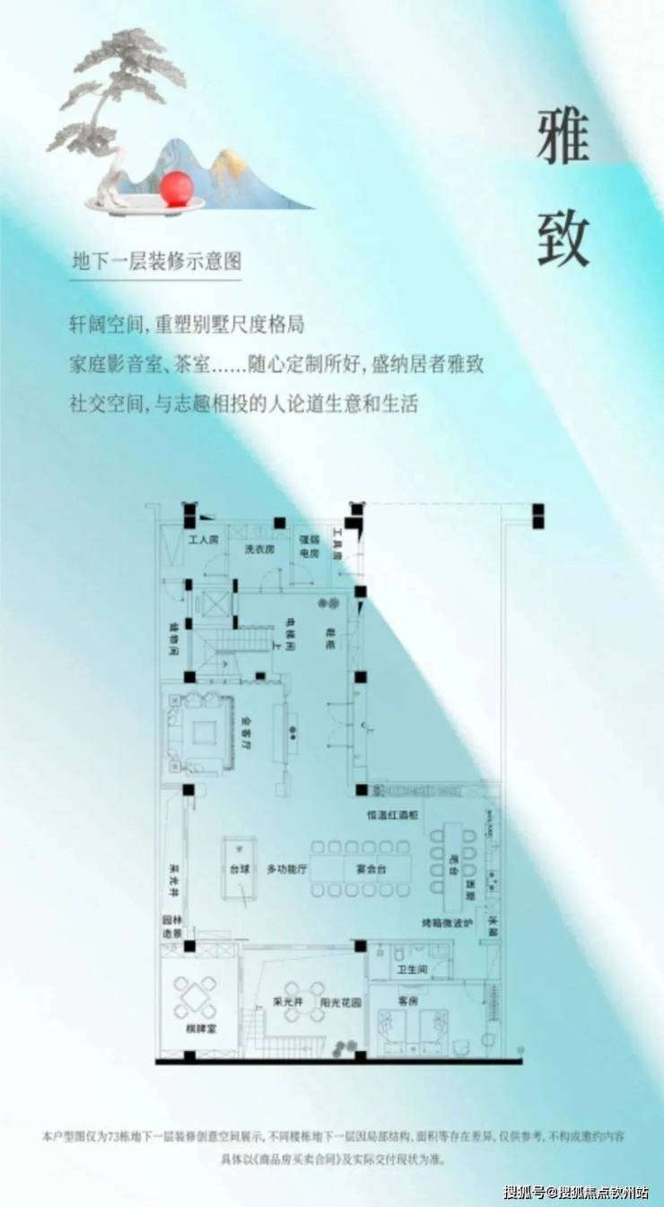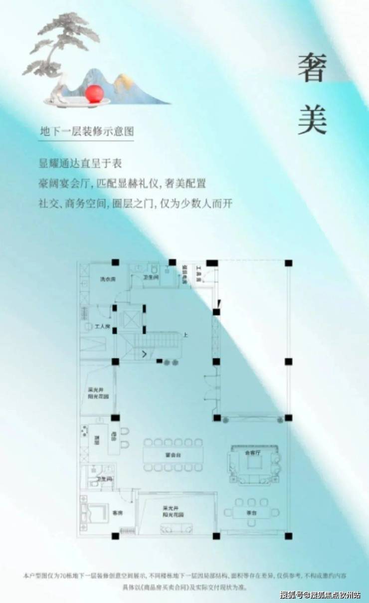 依地势抬高,地下一层相当于地面首层,阶梯相接的天井设计,负一层采光全明,形成稀缺的阳光双首层格局,避免潮湿与漏水,保护尊驾与收藏品。