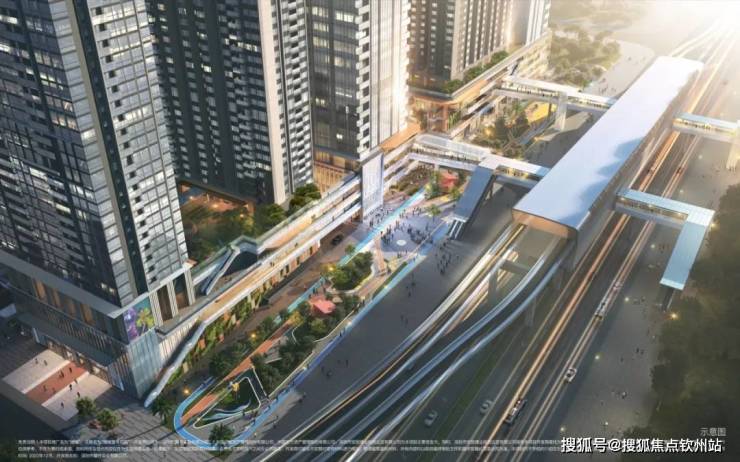 垂直交通场景:多首层设计,空中连板、无风雨连廊等,形成住宅、商业、办公与地面公交、空中地铁的接驳体系。