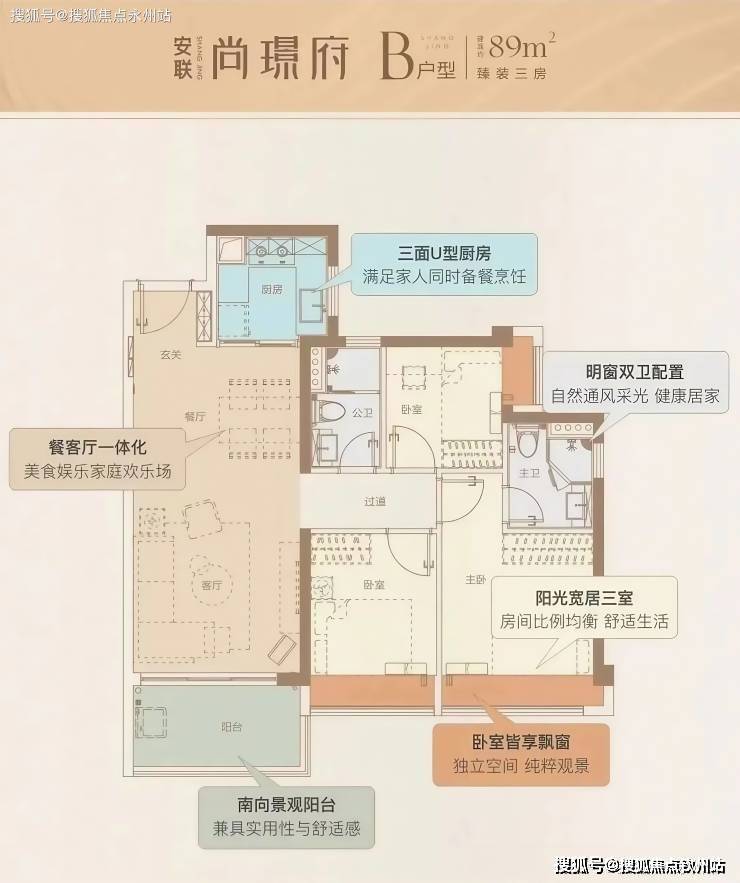 89㎡三房两厅两卫:动静分区明确,客餐厅与厨房一体化设计,直通开间约3.5米、进深1.8米的大阳台。