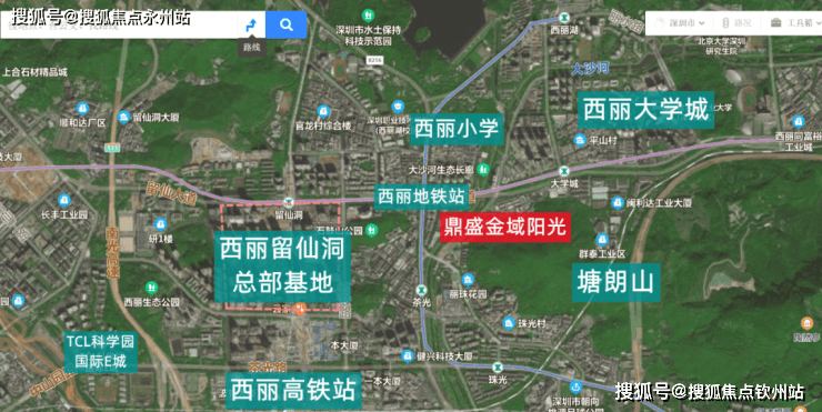项目西侧为西丽留仙洞总部基地,东北侧为大学城,东侧为塘朗山,西南侧是西丽高铁站。