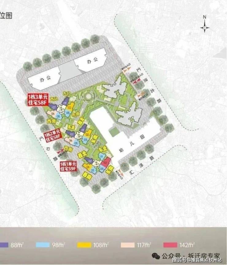 项目由8座建筑分2排组成,1栋1-2-3单元和3栋1-2单元为58-59层(约180米)住宅,标准层高2.9米,4梯6户;4栋1-2单元为35层(约165米)写字楼,2栋为幼儿园。地块住宅均为商品房性质,有1566户,配2220辆车位。