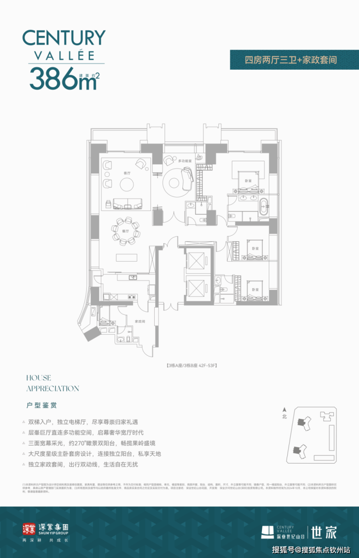 【约386㎡4+1房4卫】双梯入户,独立电梯厅,阔绰横厅直连多功能空间,三面舒适采光,主次卧双套房,270°环幕视野,还有独立家政套间,西朝向看名商高尔夫和大河沙生态长廊。
