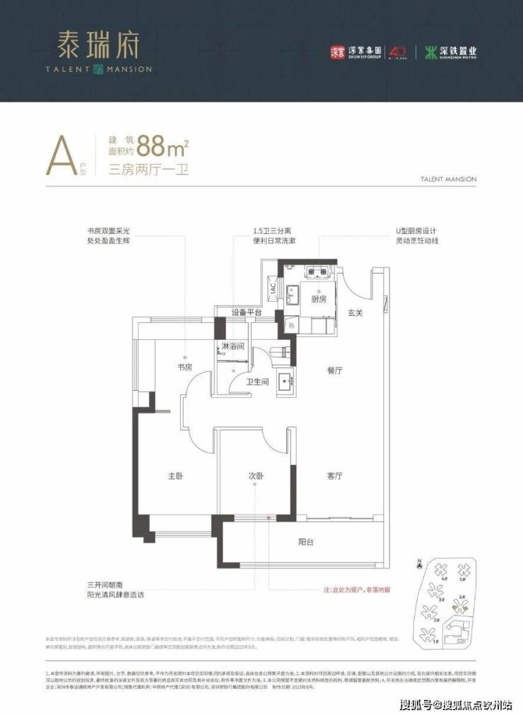 88㎡的3房2厅1卫,设计的竖厅格局,客厅连着卧室出大阳台,U型厨房,有东南朝向及西南朝向。