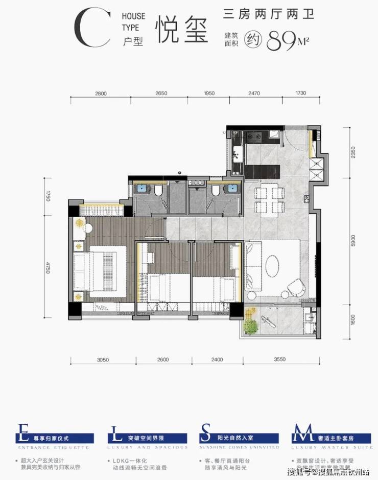 建面约89㎡ 三房两厅两卫
