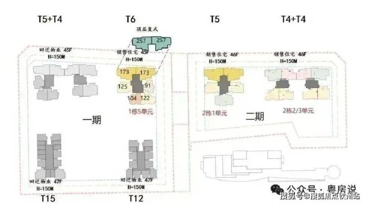 首推一期1栋5单元(45层),91-173㎡3-4房,共232套,以122-175平米4房为主,占比83%,还有两套257平顶复产品。173/257平大户型双电梯独立电梯厅入户,南区91-125平户型3梯4户。