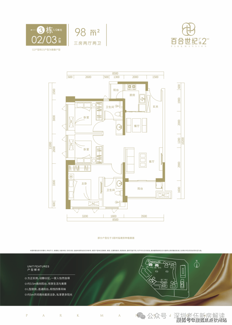 百合世纪广场,位于深圳市龙岗区布吉街道惠康路与翔鸽路交汇处,地处布吉核心板块百鸽笼片区,紧邻罗湖布心,是连接龙岗与罗湖的枢纽区域。项目北侧为万科红生活区,南侧毗邻荔山公园,直线1公里内覆盖求水山公园、围岭山公园等生态资源。这次准备推售百合世纪广场二期(B-02地块),总占地面积约3.6万㎡,总建筑面积约27.03万㎡,计容建筑面积约19.38万㎡,共由3栋7个单元组成,总高是31-48层的住宅,其中1栋1单元住宅42F,1栋2单元住宅47F,2栋1单元住宅46F,2栋4/5单元住宅48F,3栋1/2单元住宅31F,另外2栋2单元公寓30F,2栋3单元商务办公楼22F,4栋是1所九班制幼儿园。
