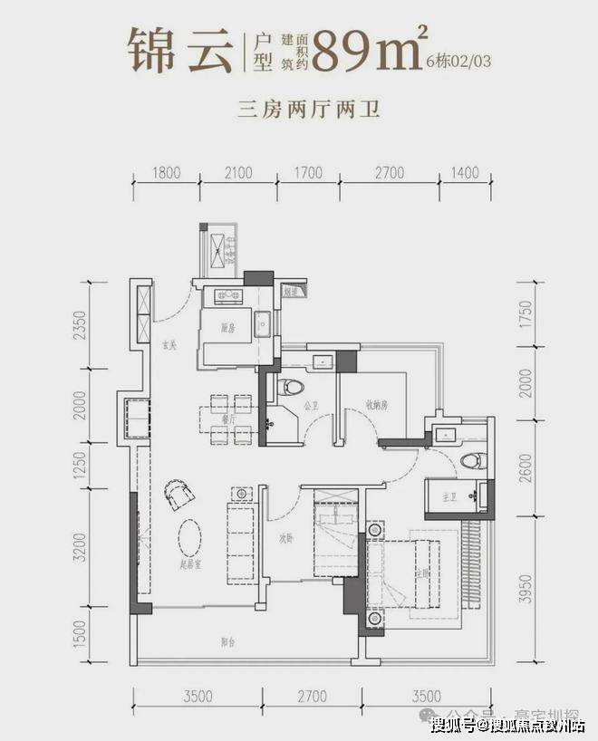【锦和玉鸣·户型品鉴】约3.1低密容积率·稀缺品质住区建面约89-130㎡三房/四房城芯低密奢居一城锦绣处 纳藏生活的晨昏四季『全新规产品理想生活越级想象』建面约89-130㎡三房/四房现代高层,大面宽尺度、大卧室、南向最大化的追光户型,引领沙井生活想象。• 锦翠·建面约89㎡3房2厅2卫:南向宽厅,阳光满溢,主卧L型采光,空间户户舒适