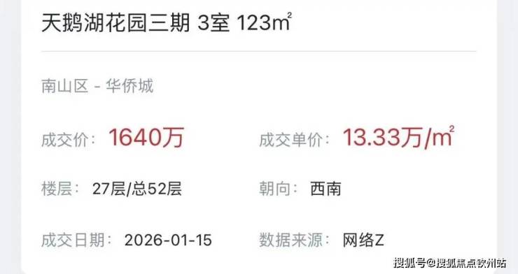而天鹅湖花园三期挂牌均价约15 万 /㎡左右,不过都以 120㎡左右小户型为主。今年1月成交的一套约123㎡房源,价格13.33万/㎡。