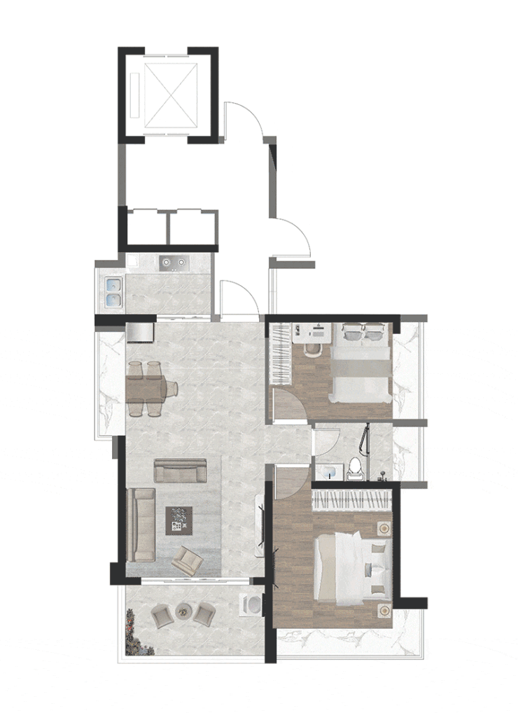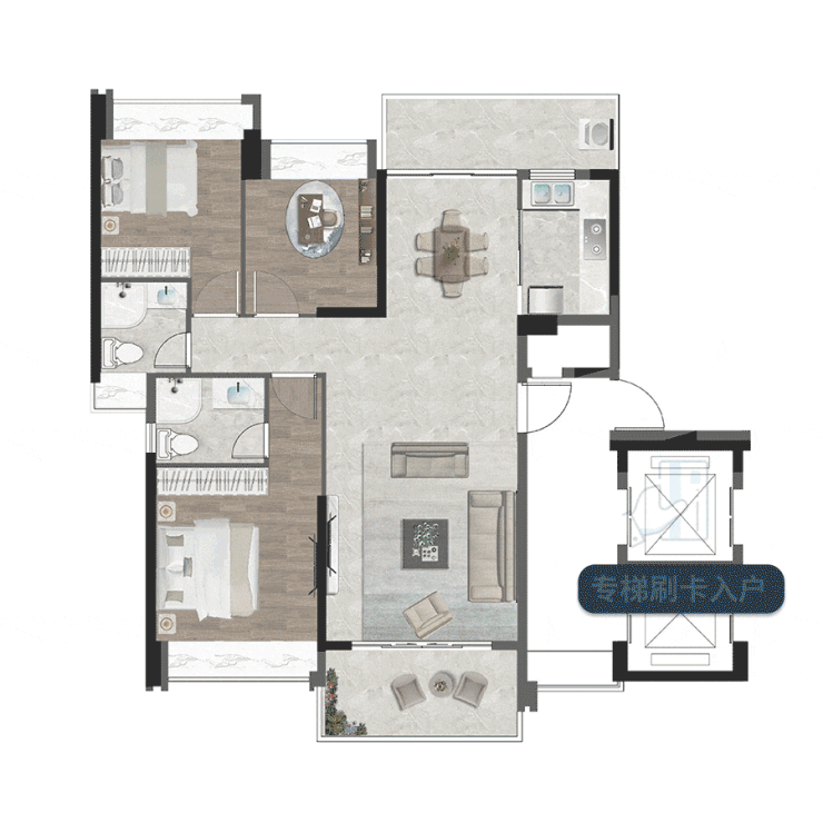 双开门电梯专梯刷卡到户,约10㎡的电梯前厅,用于摆放鞋柜、儿童车、雨伞,让归家井然有序,更能大大节省室内空间。