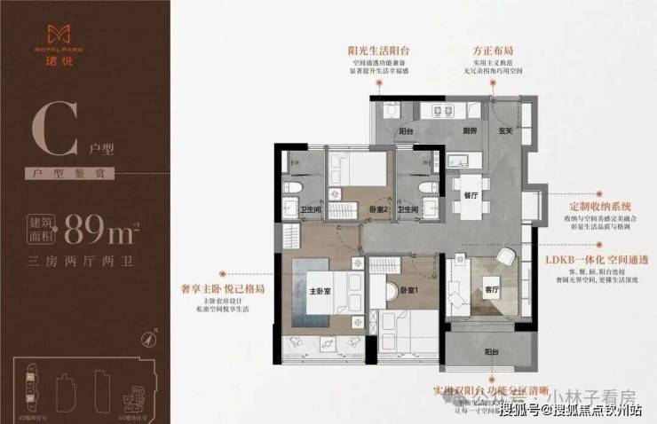 89㎡三房二卫A/B户型,位于1栋一单元,两开间阳台,主卧都有双面凸窗赠送。