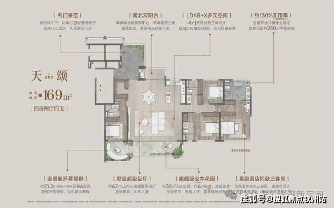 至高约130%实用率(不含电梯厅)媲美约200㎡大平层空间享受。约44㎡LDKG际会主场+约19.5米南向巨幕5.5面宽+约6米挑高空中花园+建面约36㎡、面宽约4.1米星级主卧套+全南4卧室、开间超3米+主卧270°全景视窗,成为世家专属的人居答案;