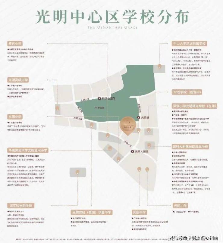 周边还有深圳小学光明曙光学校(在建,预计2024年开学),光明小学,华师大附小,深圳实验光明学校,光明高级中学,光明中学,中山大学深圳附属学校等。