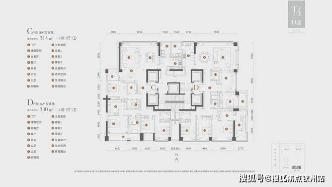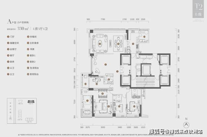 B/C户型:330m²四房三厅四卫,南北通透(卧室全南向)