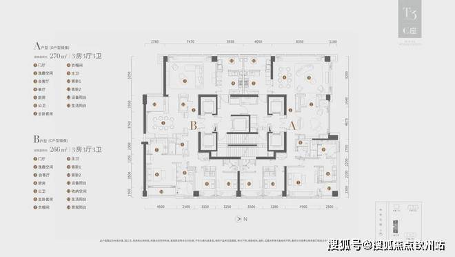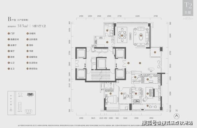 A/D户型:313m²三房三厅三卫,南北通透(卧室全南向)