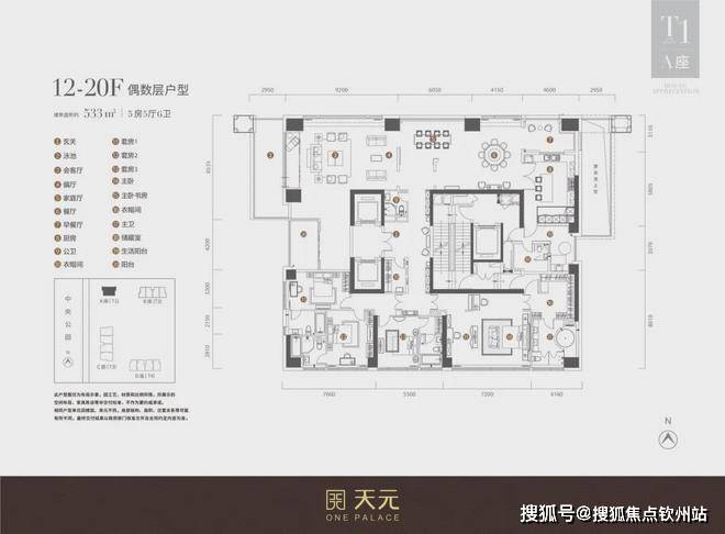 12-20F偶数层户型:533平,五房五厅六卫,南北通透
