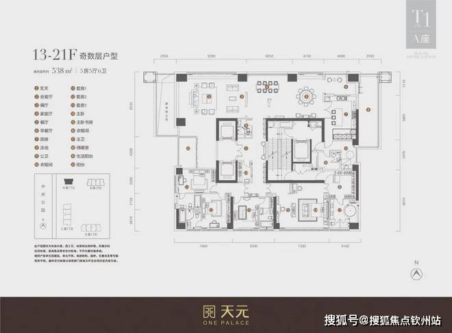 13-21F奇数层户型:538平 五房五厅六卫,南北通透