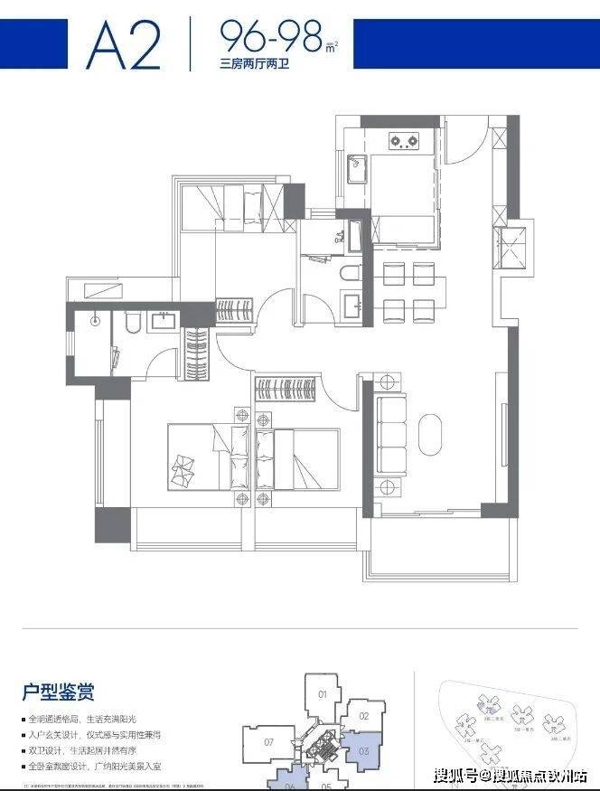 建面约96-98㎡3房2卫,折后约350-401万;