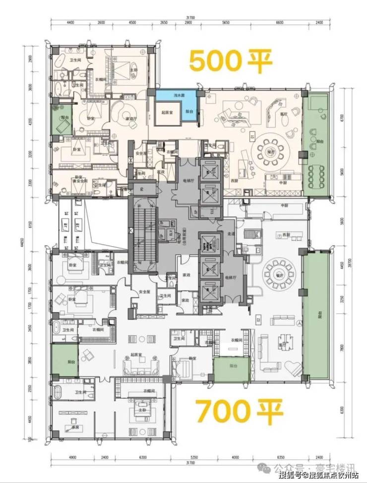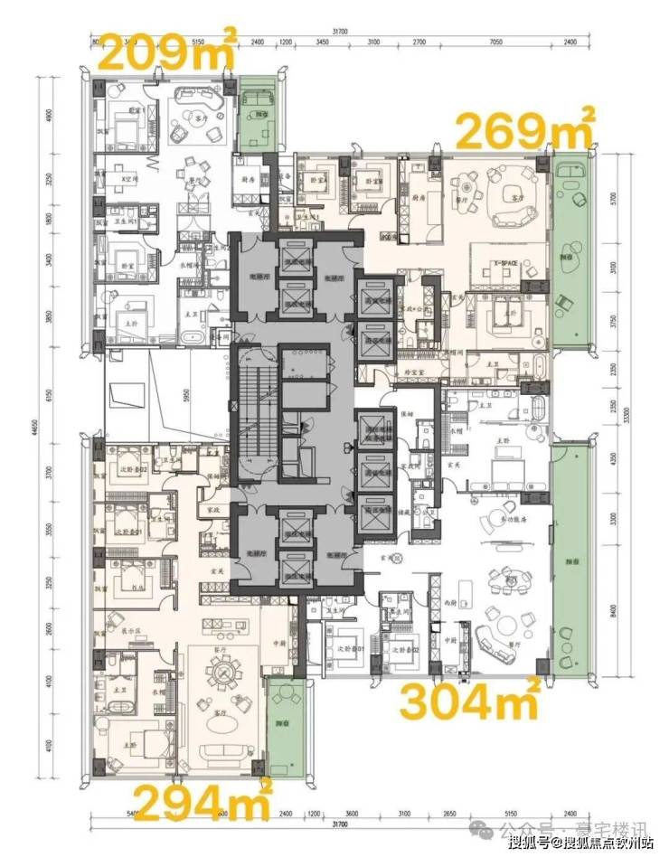 超高区(58层起,200米以上):约500-700㎡顶级大平层。
