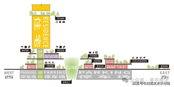 布局特点:塔楼采用“分层递进+错位排布”设计,东西朝向为主,全玻璃幕墙立面,以“竹韵”曲线为灵感