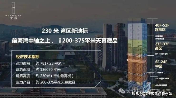 华侨城宝辰总高230米,为宝中最高楼;项目52层,分为中区、高区、超高区,6层起卖,11、39F为避难层,25-26F为空中会所,28F为空中大堂。除了空中大堂项目还有地下入库大堂+首层大堂,一共三重大堂。