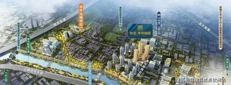 特发学府朗园,项目位于光明区公明李松萌炮台路与志康路交汇处,项目西北侧是深圳外国语光明学校
