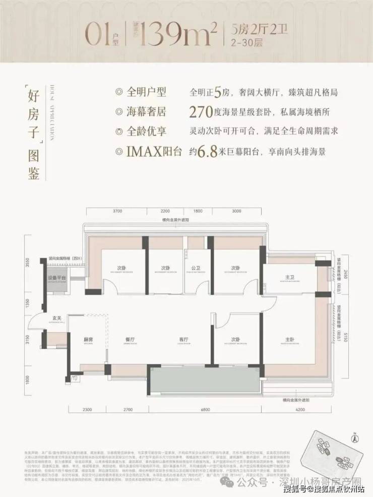 139㎡的5房2厅2卫,设计的是横厅南北通透格局,进门可做800库玄关还带1个设备平台,客餐厅6.5米开间,LDKB一体化,六开间朝南,分别做到了主卧21.63㎡/次卧13.13㎡/次卧10.65㎡/次卧9.45㎡/次卧7.81㎡(包含墙体飘窗),U型厨房,卫生间干湿分离,得房率约81.4%(不含赠送),客厅连接次卧出6.8米长的观景大阳台约12.24㎡,西南朝向。